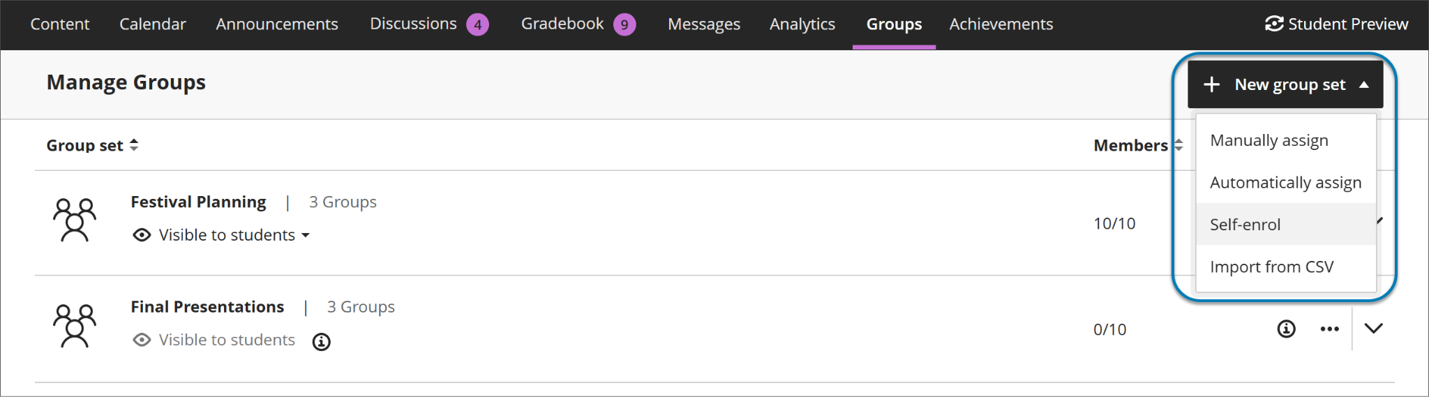 A more logical setup flow. Instead of diving straight into managing individual students, you now start by choosing how you want to structure your groups: manual assignment, automatic assignment, self-enrollment, or CSV import. This upfront choice eliminates a lot of guesswork.